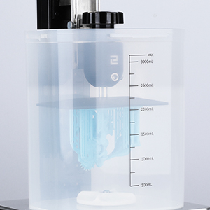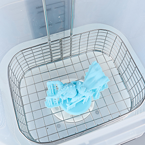Wydrukowane detale można umieścić bezpośrednio w koszu i w pojemniku ze środkiem do czyszczenia wydruków (resin cleanerem lub alkoholem IPA) lub cała platformę po zdjęciu z drukarki zawiesić nad pojemnikiem z cieczą na specjalnym uchwycie, znajdującym się w zestawie.